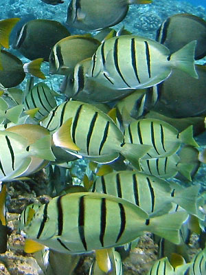 Convict and Yellow Tang FishConvict Tangs (in picture) and Yellow Tangs are similar in shape but have differing color patterns. Both reside in Hanauma Bay and are found in the shallow regions of the water. They stick to oxygen-enriched areas because of the algae growth. These fish feed on the fine, filamentous algae that grow on rocks and stones that have good sunlight exposure. Their main diet consists of marine algae and they spend most of their day grazing. You’ll find them along the underwater rocky regions of Hanauma Bay where algae grow. They are somewhat territorial fish, and will defend a certain hiding place from intruders. Keep this in mind when you are snorkeling so you can be wary of leaving their hiding places alone. They travel in small schools and stick close together. Both varieties of the Tang Fish had arrow-like body shapes. This is due to their dorsal and ventral fins being almost an extension of their bodies. In addition, they have long snout-like mouths used to eat the algae off rocks. Convict and Yellow Tang Fish CharacteristicsBoth types of fish are very popular in salt-water aquarium setups, so you may already be familiar with their appearance. The yellow tang fish is easily recognizable by its lemon yellow color. They are yellow throughout their body, generally with no variation in color. When these fish are sleeping or stressed, a white line appears on the flanks of the fish, so you can tell if you are invading their space. They are very thin fish and are only 3 to 5 inches in length and height and less than 1 inch thick. Convict Tangs, also called Manini by the Hawaiian people, are much less bright and colorful. They have a light grey/green body above and are cream or white on their underbellies. They have six black vertical bands on their body. This variation helps camouflage them from predators. Manini are bigger than yellow tangs and are about seven to eight inches on average. |